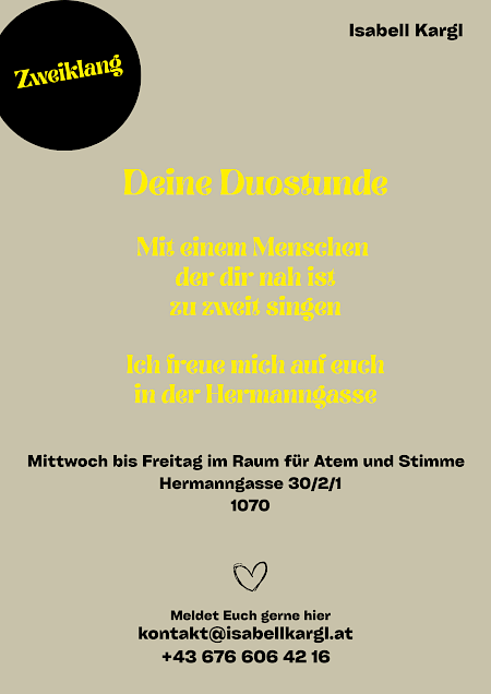 Vielleicht hast du Lust, die Duo-Stunde gemeinsam mit jemandem zu erleben, der Dir nah ist – Partner:in, Freund:in, Verwandte:r oder einfach ein lieber Mensch :-)Zu zweit singen, zweistimmig, Raum teilen - in der Hermanngasse |